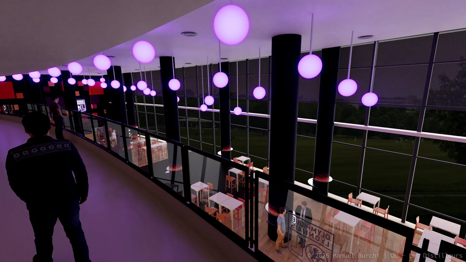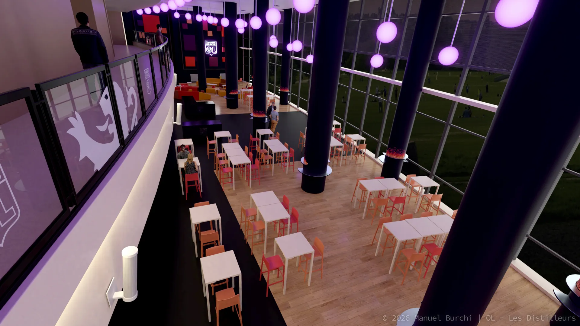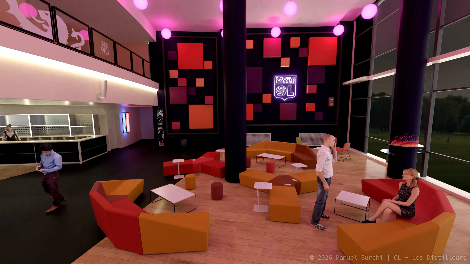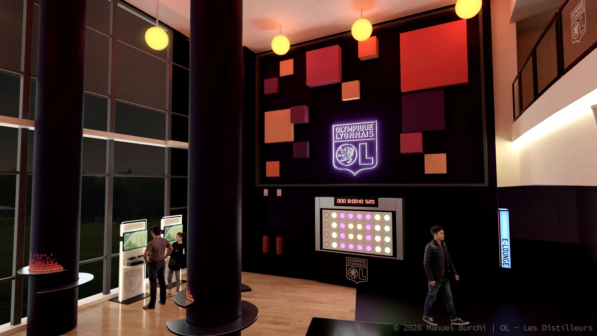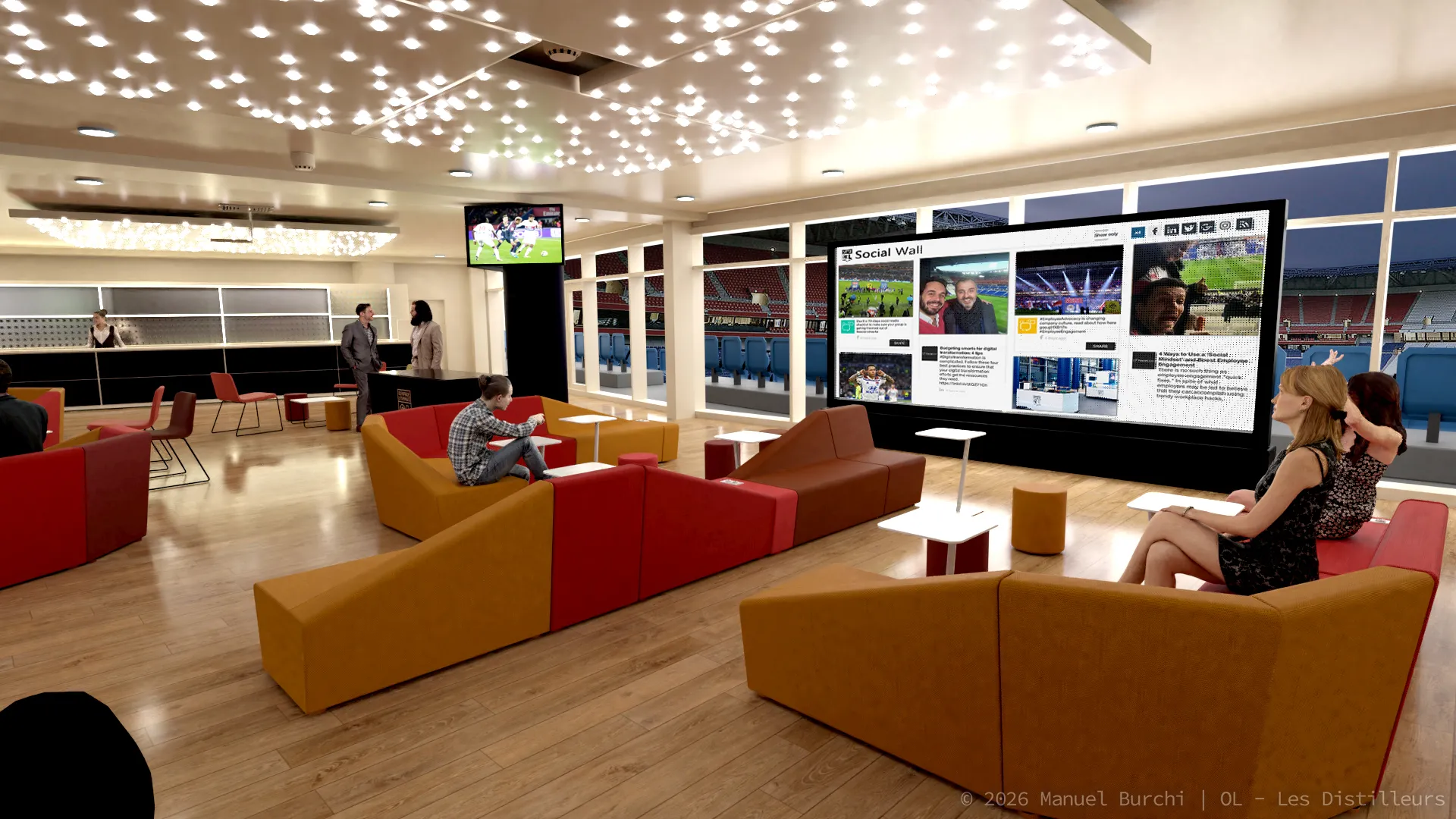 Modélisation 3D photoréaliste du salon VIP de l'Olympique Lyonnais pour le studio Les Distilleurs. Travail sous Blender sur l'architecture intérieure, l'aménagement et le mobilier. Visuels utilisés comme preview technique avant la réalisation réelle du lieu.