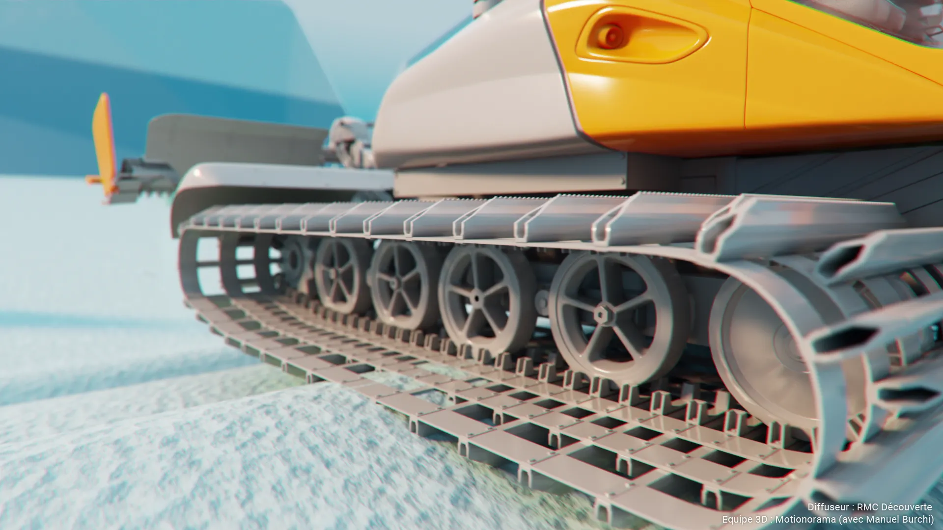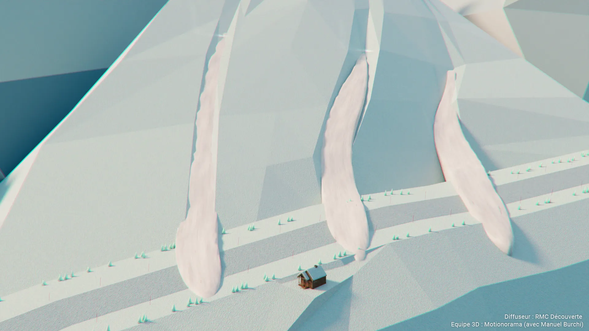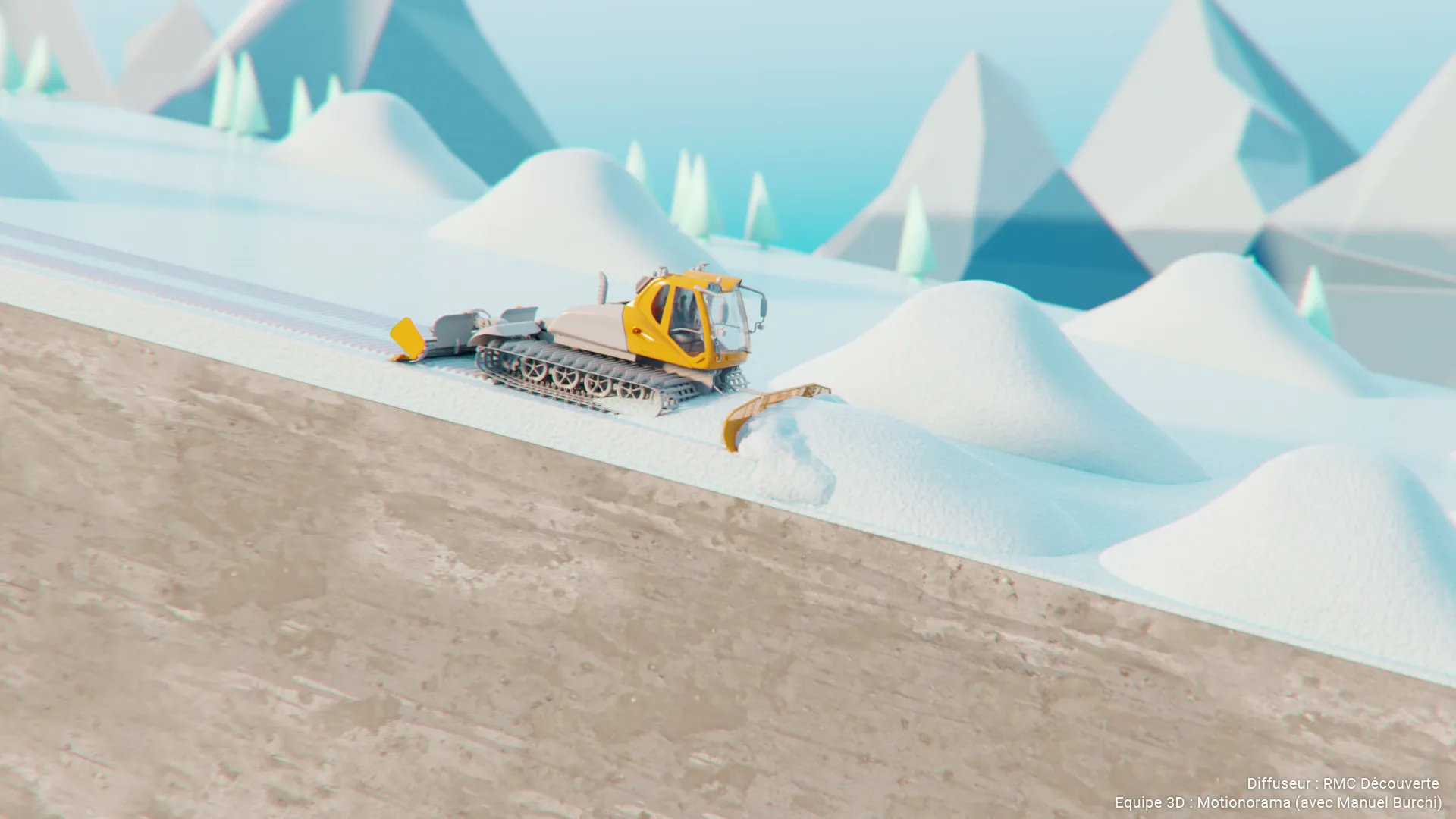 Collaboration avec le studio Motionorama pour la création des séquences 3D du documentaire Titans des neiges, diffusé sur RMC Découverte.